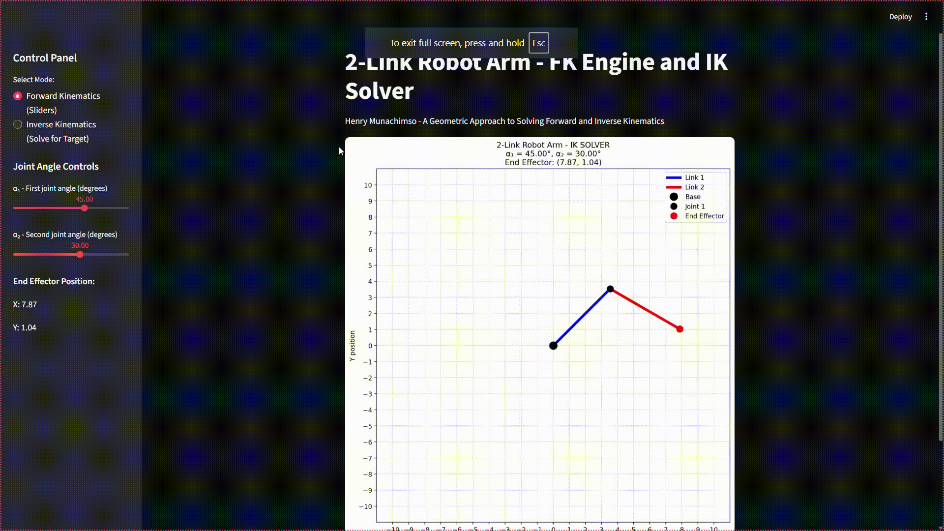 In this screen-recording I walk through all the Ik & FK Engine has to offer. In the Forward Kinematics (Sliders) mode, I manipulate the respective sliders for α₁ and α₂ by the left hand menu. α₁ is defined as +ve CCW from the origin and α₂ is +ve CW from the global x-axis with respect to the second joint.